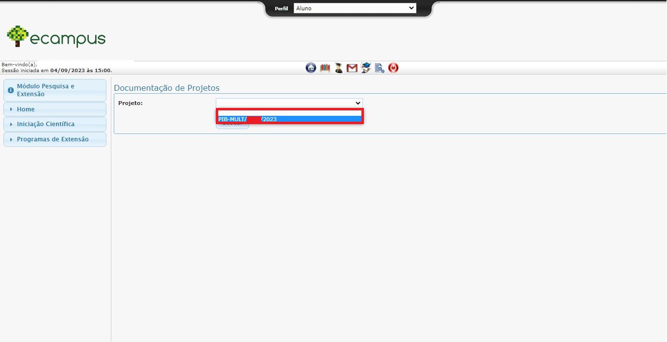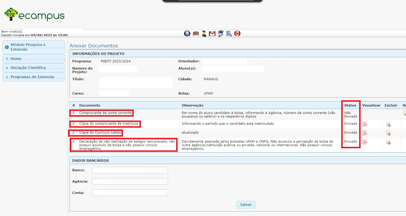 1. A documentação, contida no item 14 (DA DOCUMENTAÇÃO A SER ENTREGUE APÓS APROVAÇÃO DO PROJETO) do Edital nº 02/2023 PROTEC - PIBITI 2023/2024, deverá ser inserida pelo próprio discente, através do Portal E-campus, conforme o fluxo abaixo: