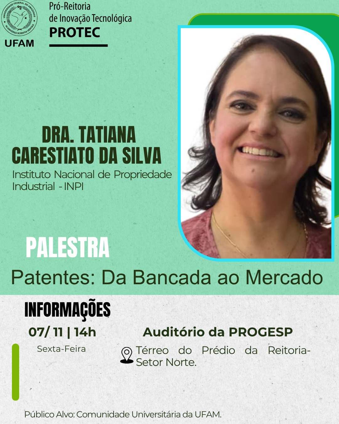 A Pró-Reitoria de Inovação Tecnológica (PROTEC/UFAM) tem a honra de convidar Docentes, Técnicos Administrativos em Educação (TAES) e Discentes para a palestra: